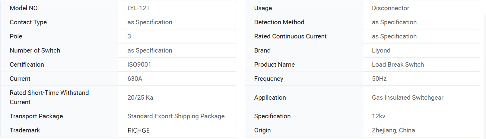 LYL-12T lastbrytare uppfyller de relevanta kraven i GB3804-2004 "3,6kV~40,5kV högspänningsväxelströmbrytare" och GB16926-1997 "växelspänningslastbrytare-säkringskombinationsapparat". Huvudkrets: 630A-20kA (4s), 25kA (3s); Mekanisk livslängd: 5000 gånger; Jordningskrets: 20kA (2s); Mekanisk livslängd: 2000 gånger.