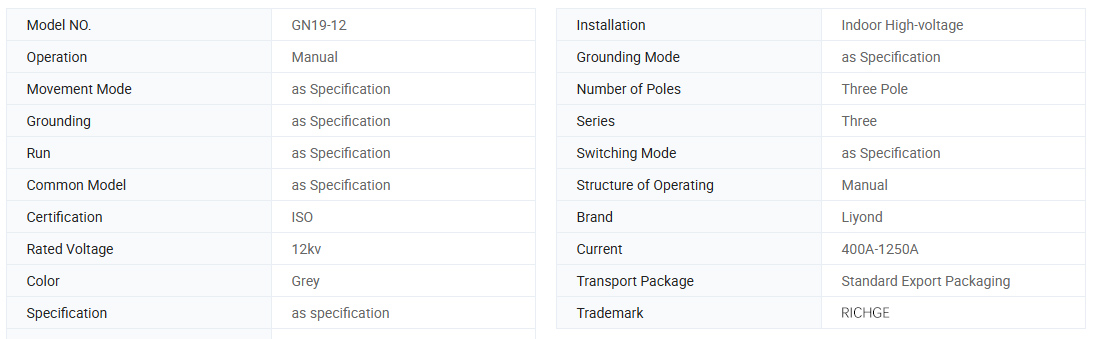 GN19-12, 12C-serien inomhus högspänningsfrånskiljare (hädanefter kallade frånkopplingsbrytare) är inomhusenheter med en märkspänning på 12kV, trefas AC 60Hz, och används för att dela och stänga kretsar när det finns spänning och ingen belastning.