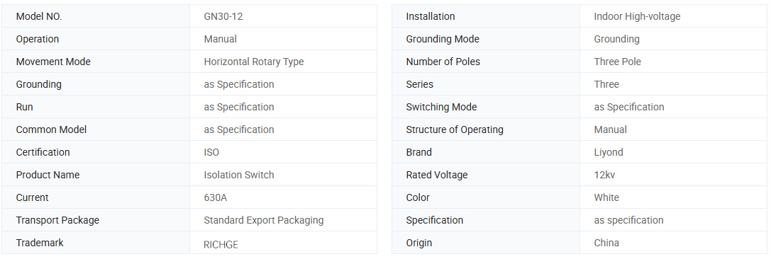 GN30-12 (D) typ roterande inomhus högspänningsfrånkopplingsbrytare är en ny typ av isoleringsbrytare av roterande knivtyp, huvudstrukturen är fixerad två grupper av isolator och kontakt på de två plan av trefasiga chassi, genom den roterande kontakten, realisera omkopplaren på-av. GN30-12 (D) omkopplare är en ny typ tillagd jordkniv på GN30-12 typ omkopplare, som kan möta behoven hos olika kraftsystem. Produktdesignen är med kompakt, litet upptaget utrymme, stark isoleringsförmåga, enkel installation och justering, dess prestanda uppfyller GB1985-89 "AC-högspänningsisoleringsbrytaren och jordningsbrytaren", tillämpliga på märkspänningen 10kV AC 50Hz och lägre inomhuskraftsystem, för att öppna och stänga kretsen när den är spänningssatt, utan belastning. Den kan användas med högspänningskopplingsskåpet och kan även användas separat.