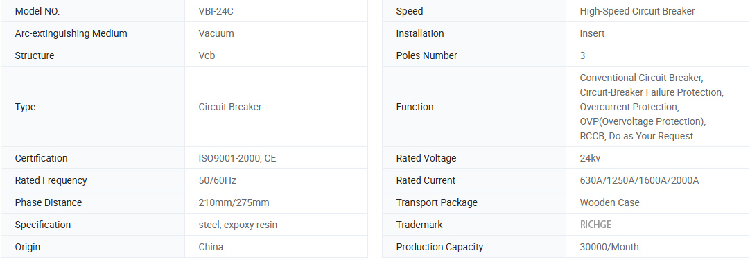 VBI-24 VCB vanligtvis monterad i switchgear-panelen Kyn28 och XGN. Det är tillämpligt i tillfällen med ofta drift, har funktioner av höghastighetsåterlämnare, multipel öppnings-/stängning, pålitlig mekanisk låsning. Det har fast typ och uttagbar typ.